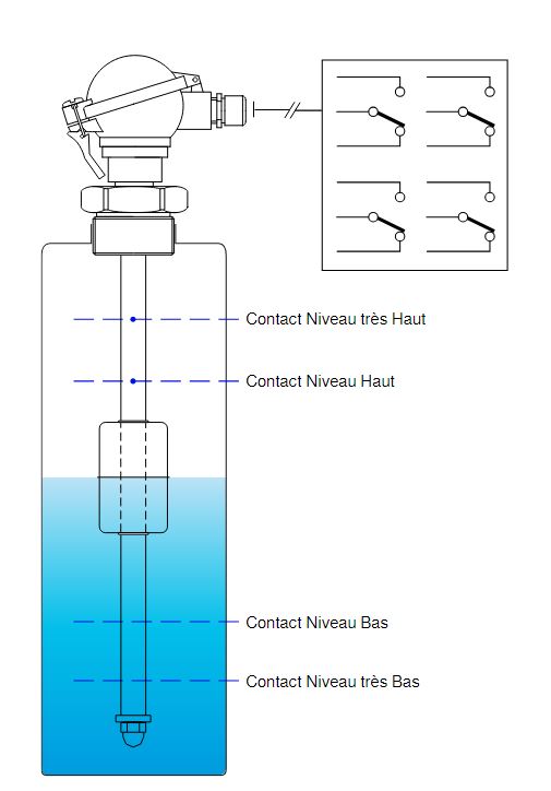 Les contacts Reed disposés dans le tube plongeur sont actionnés au passage du flotteur magnétique, permettant ainsi une détection de 1 à 4 niveaux selon l’application. Les contacts REED sont inverseurs et bistables (seul un passage du flotteur peut faire à nouveau basculer le contact).