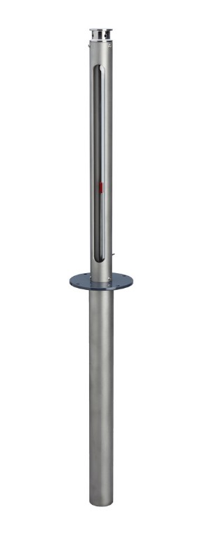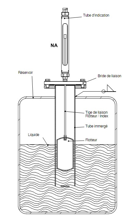 Un flotteur solidaire d'une tige entraîne le déplacement d'un index dans un tube verre Borosilicate situé au dessus du réservoir. La lecture du niveau se réalise sur place au visu de l’index en bout de tige.