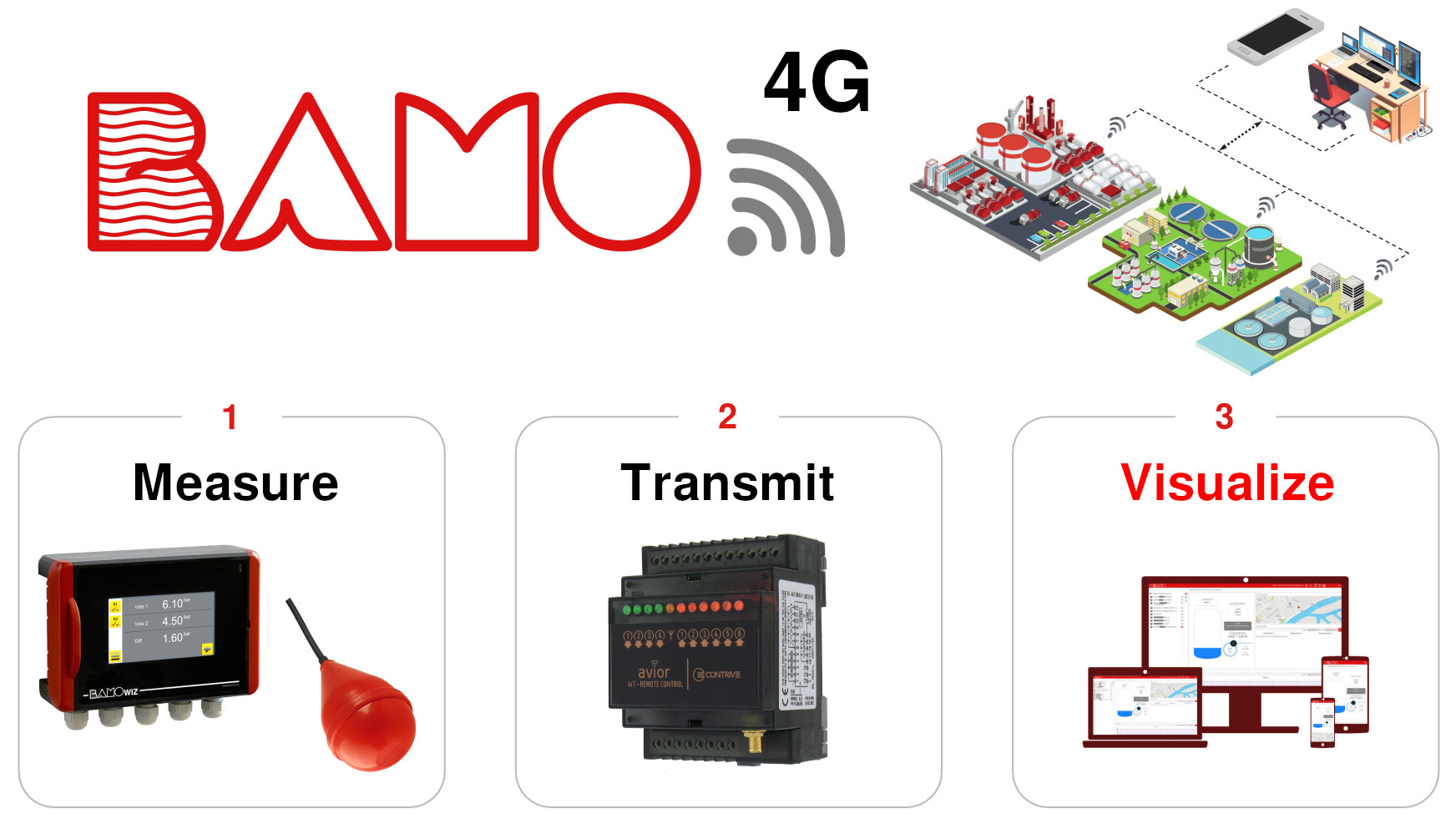 BAMOCloud is an online platform designed to easily view and use data collected in the field. It supports BAMOPHAR and BAMOWIZ indicators, as well as 4-20 mA or On/Off sensors, and allows remote access.